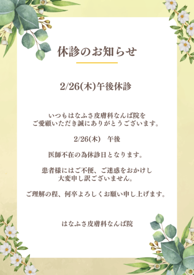 いつもはなふさ皮膚科なんば院をご愛顧いただきありがとうございます。