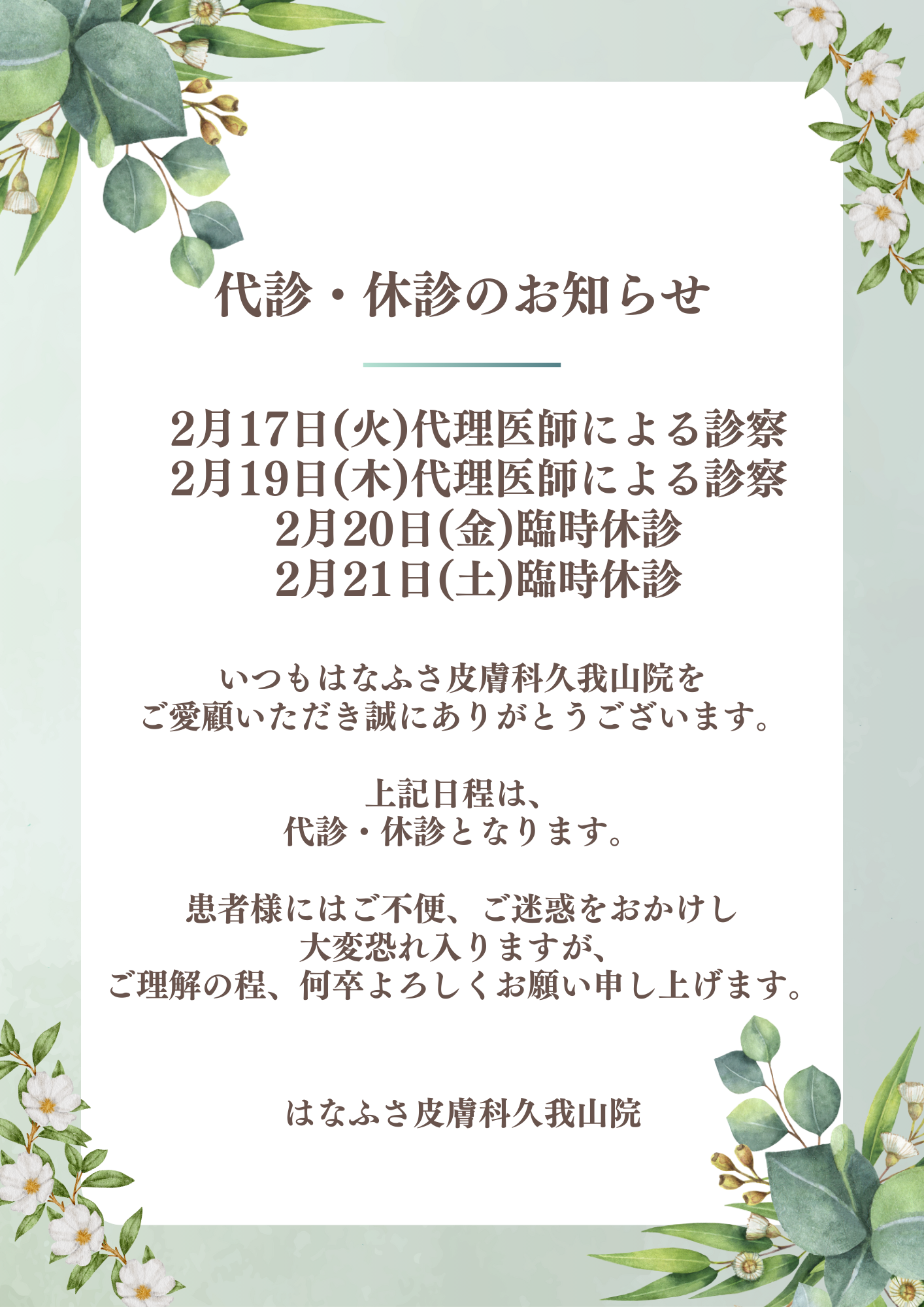 【久我山院】2月代診・休診のお知らせ