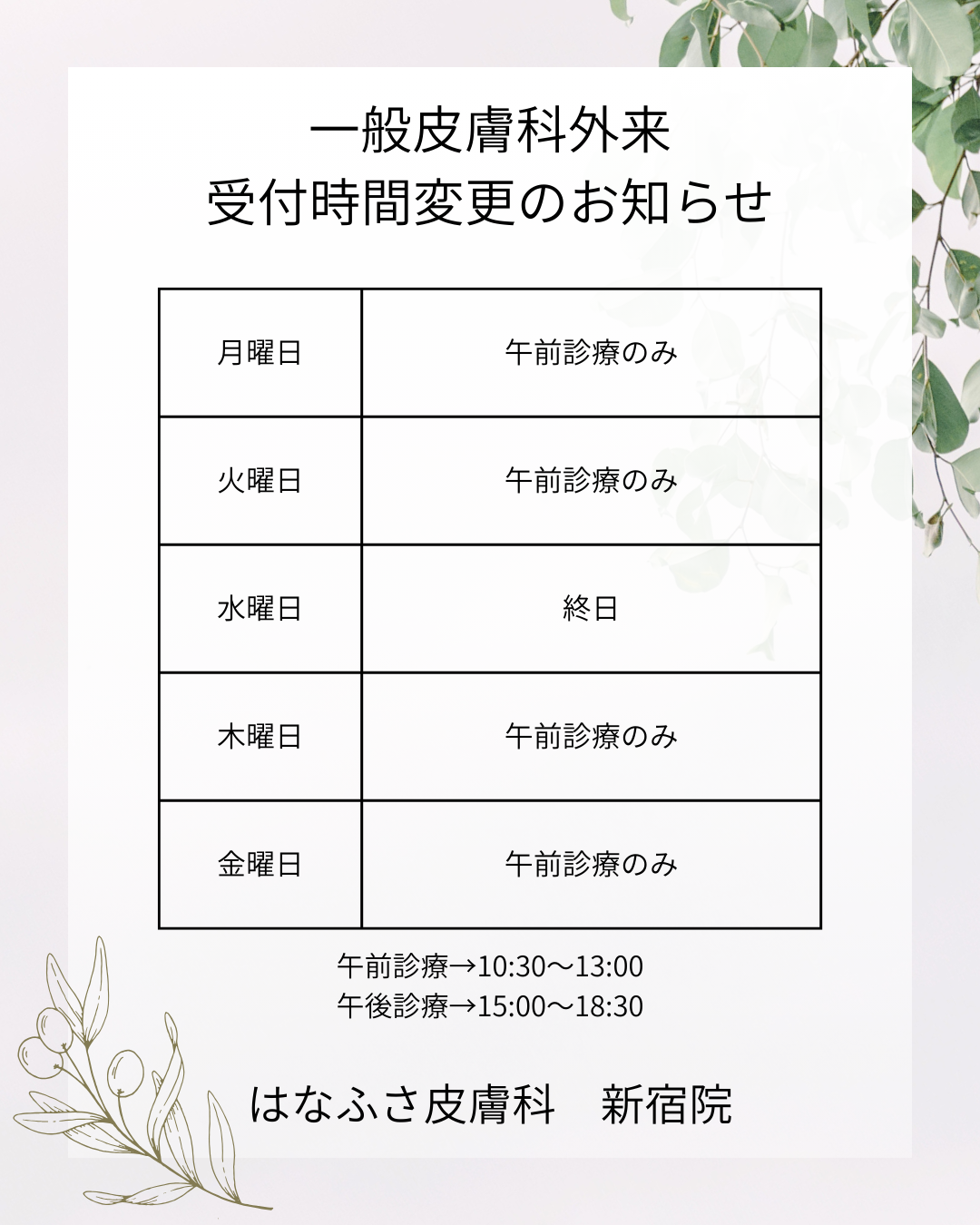 HOME > お知らせ > 【新宿院】一般皮膚科外来受付時間変更のお知らせ