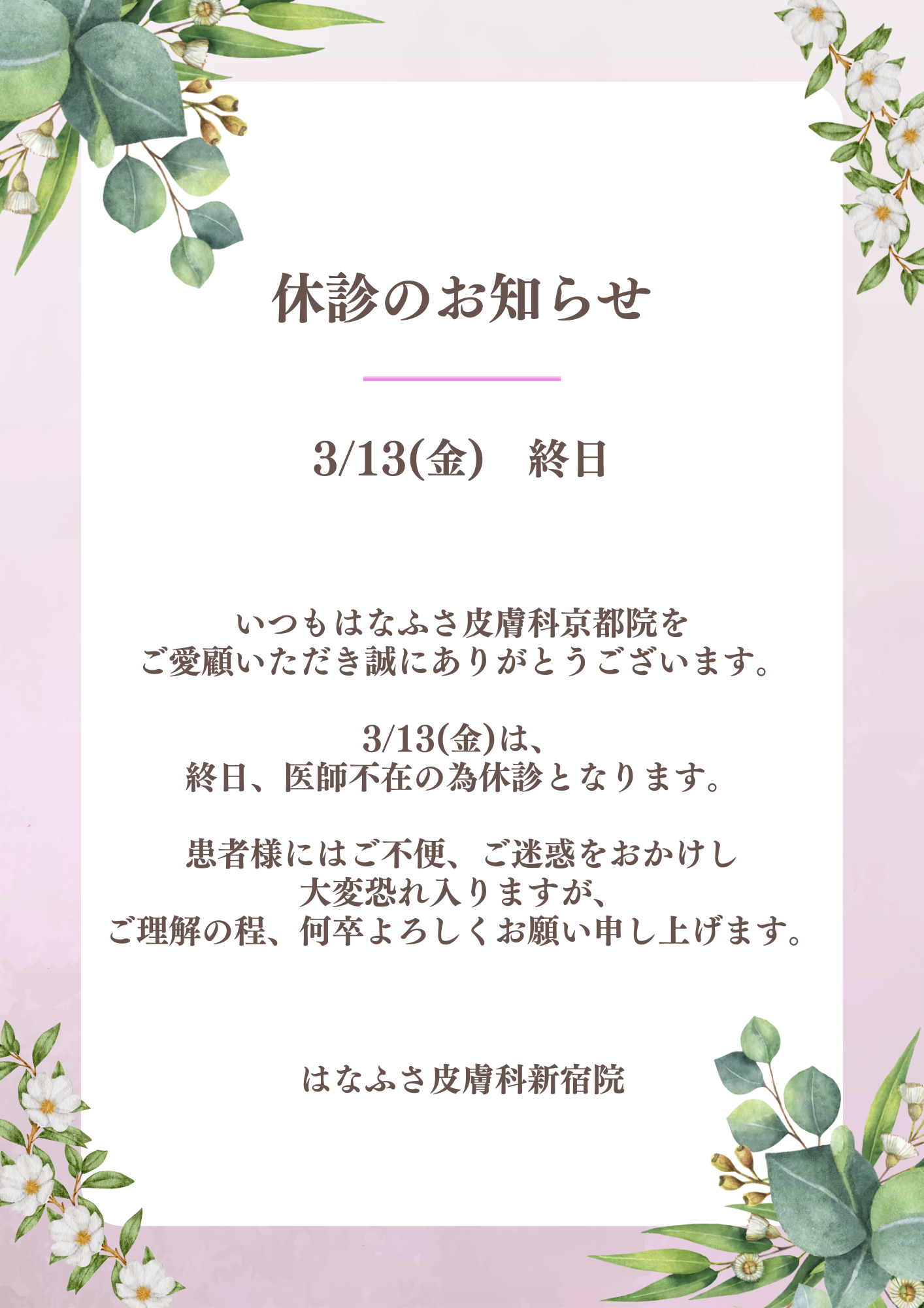 HOME > お知らせ > 【新宿院】3/13(金)休診のお知らせ