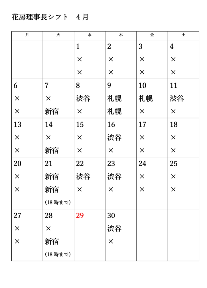 令和8年4月 理事長 花房火月のスケジュールをお知らせいたします。